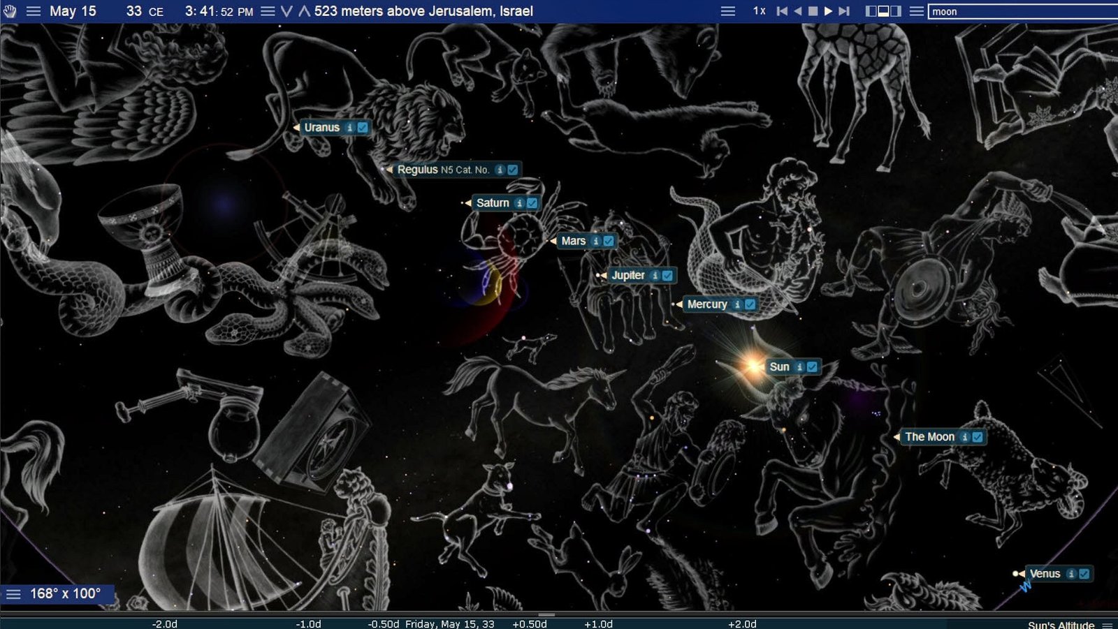 - AD 33 inner structure: Jupiter & Mercury in Gemini (Acts 14:12; 28:11 resonance); Saturn & Mars in Cancer (unordered pair); Regulus as terminus; Uranus (unknown in antiquity) — excluded from the count even though it sits at the train’s caboose and continues the visual periodicity.