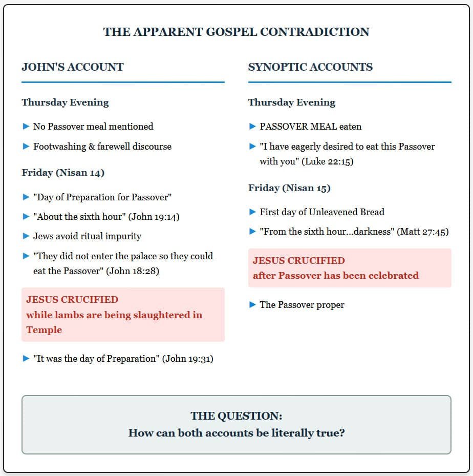 This moment of convergence was no accident. For centuries, a chronological tension has perplexed readers of the Gospels. John declares with unwavering clarity that Jesus died on the Day of Preparation, Nisan 14, while the Passover lambs were being slaughtered in the Temple. The Synoptic Gospels, with equal conviction, present Christ as having shared the Passover meal with His disciples the evening before His death. How can both accounts be true? How can the Lamb of God die both as the lambs are being prepared and after the Passover has been consumed?
