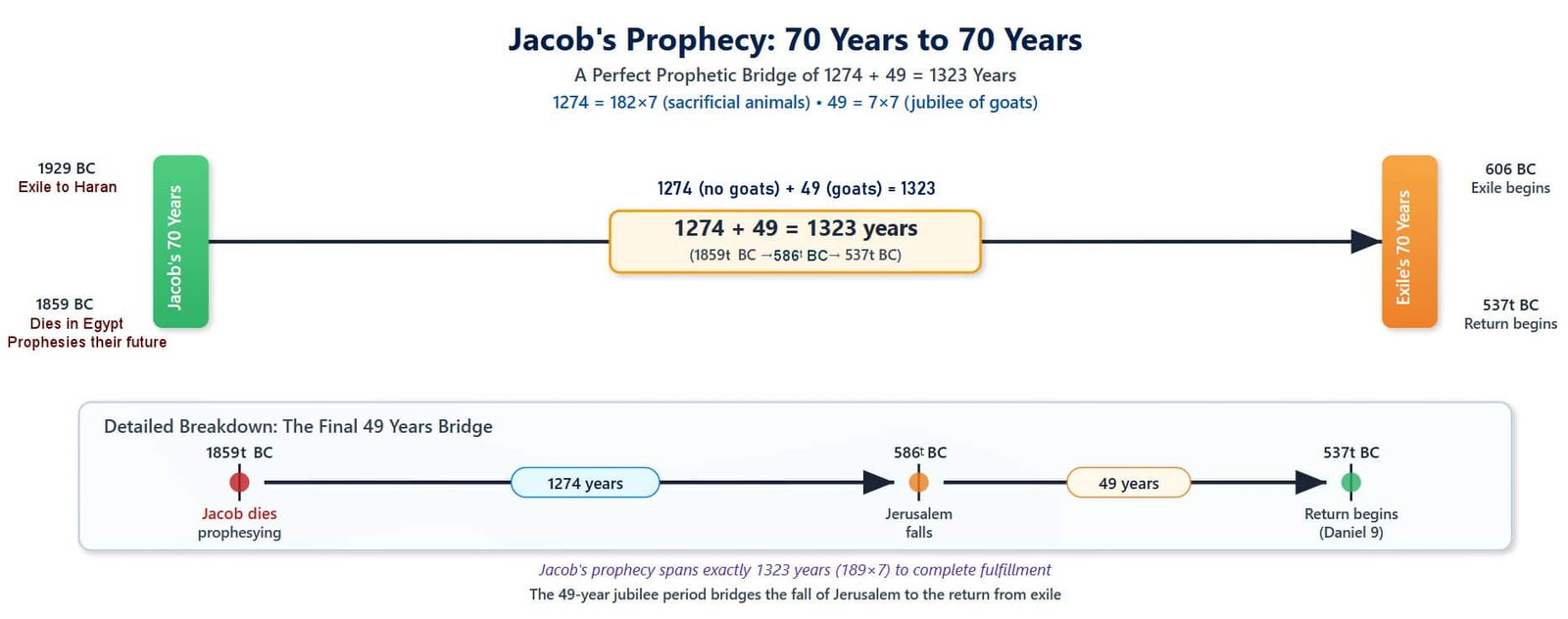 Assumptions. Anchor at 1859 BC (Jacob’s death horizon). For each Sukkot day, use the Numbers 29, day‑total (with goats), then scale ×7 years for the shemitah. No year‑zero; t/n conventions per “Counting conventions (quick reference)” in §5.