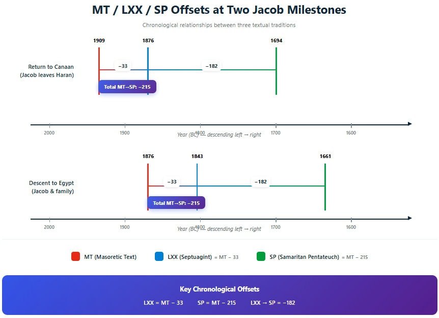 Figure 3 — “MT/LXX/SP offsets at two Jacob milestones.” §10 anchor offsets for 1909/1876/1694 (return to Canaan) and 1876/1843/1661 (descent to Egypt).