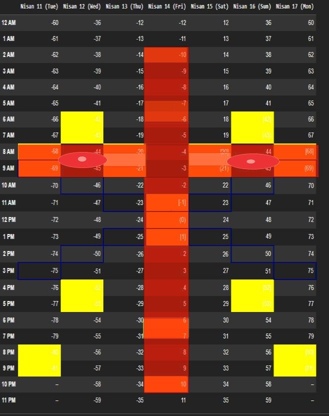 11 | 18:19 | “in one hour she is laid waste” | −10 | 01:30 – 02:30 | +10 | 21:30 – 22:30 | Babylon lament 3 |