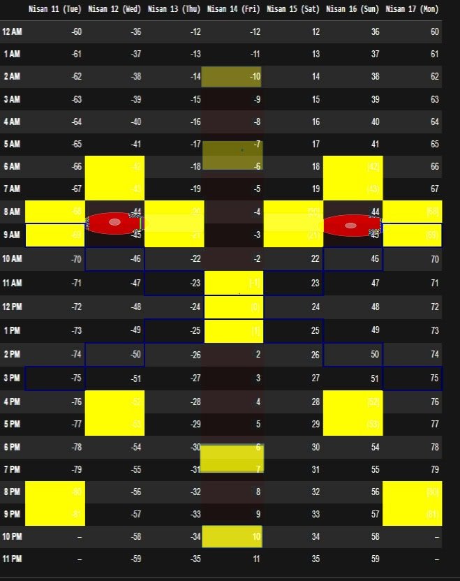10 | 18:17 | “in one hour such wealth” | −9 | 02:30 – 03:30 | +9 | 20:30 – 21:30 | Babylon lament 2 |