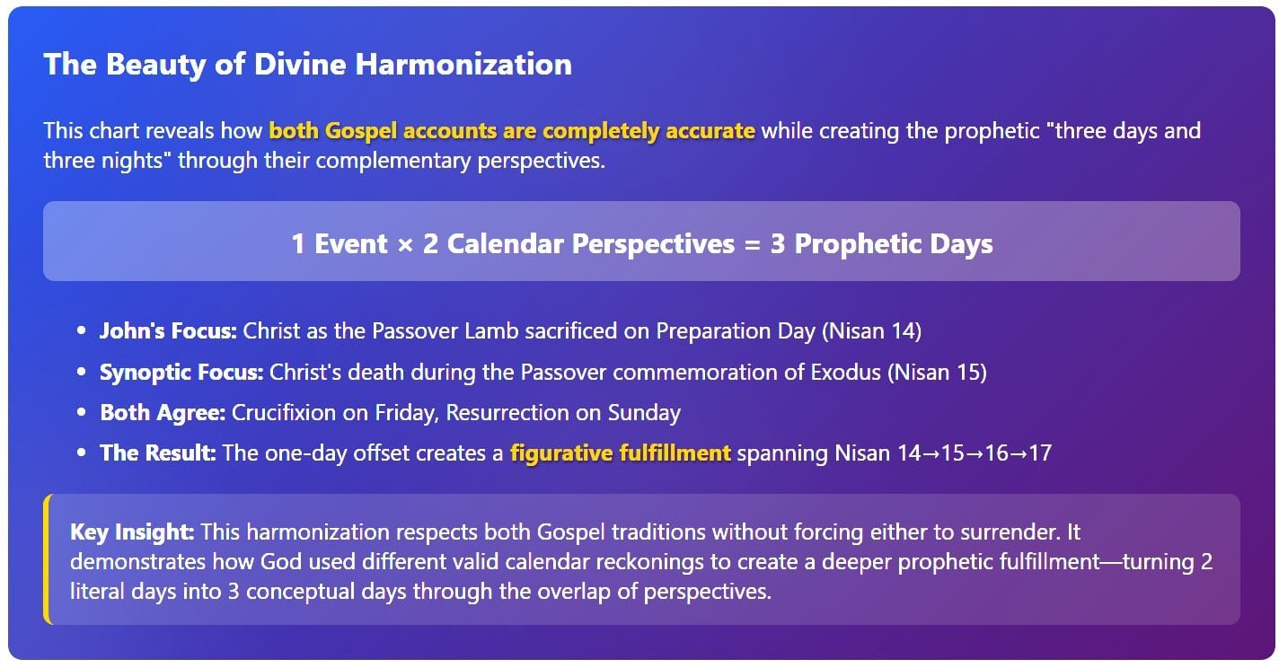 Both reckonings reflect true aspects of the same event. As Genesis 1:5 allows for both evening and morning to frame a day, so too John allows the Synoptics and his own Gospel to frame Passion Week through complementary, not contradictory, calendars.